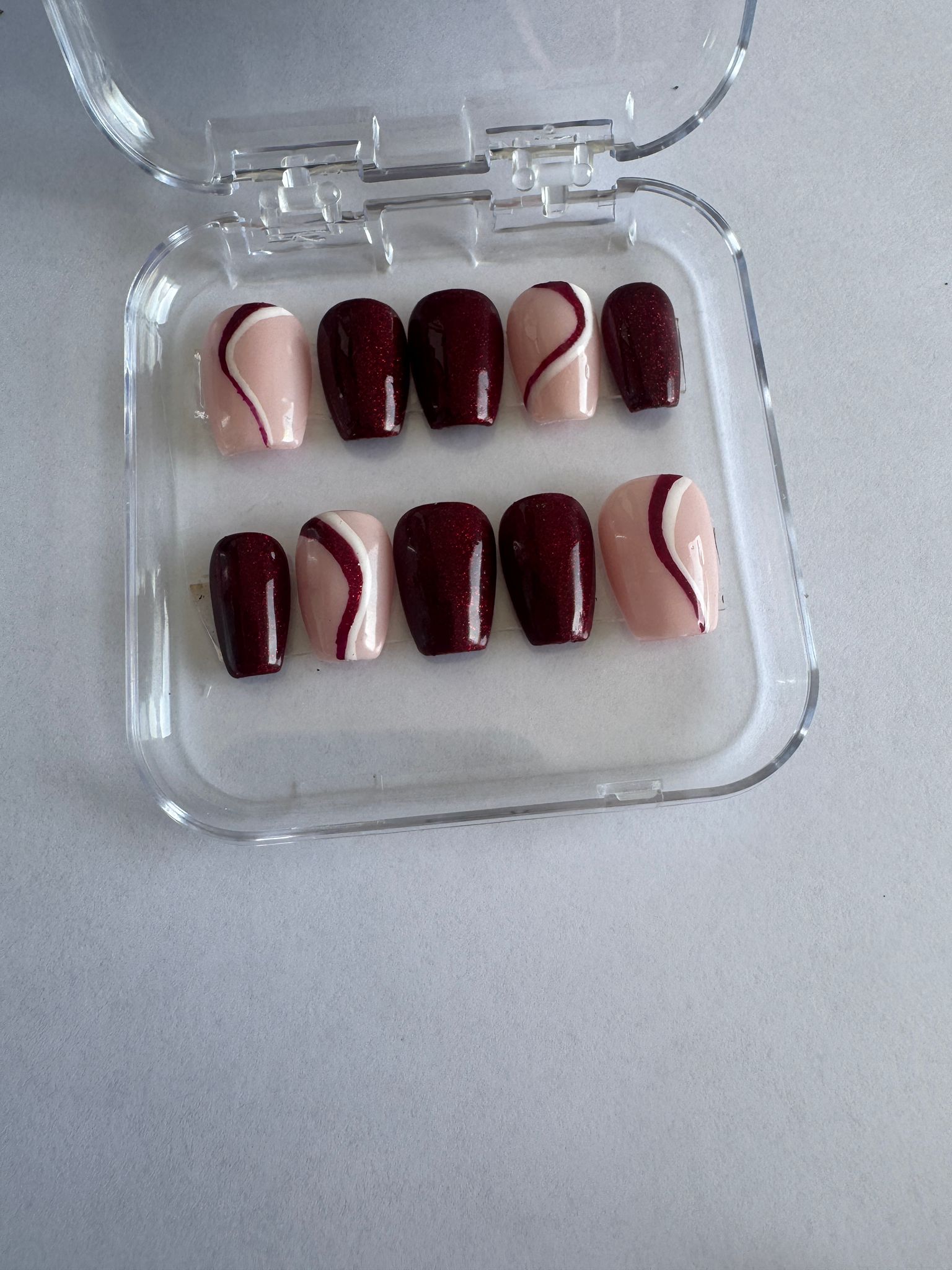 Dale un toque de sofisticación a tus manos con nuestras uñas press on de diseño exclusivo en tonos burdeos y nude. El elegante patrón de ondas crea un efecto visual único que combina glamour y modernidad.